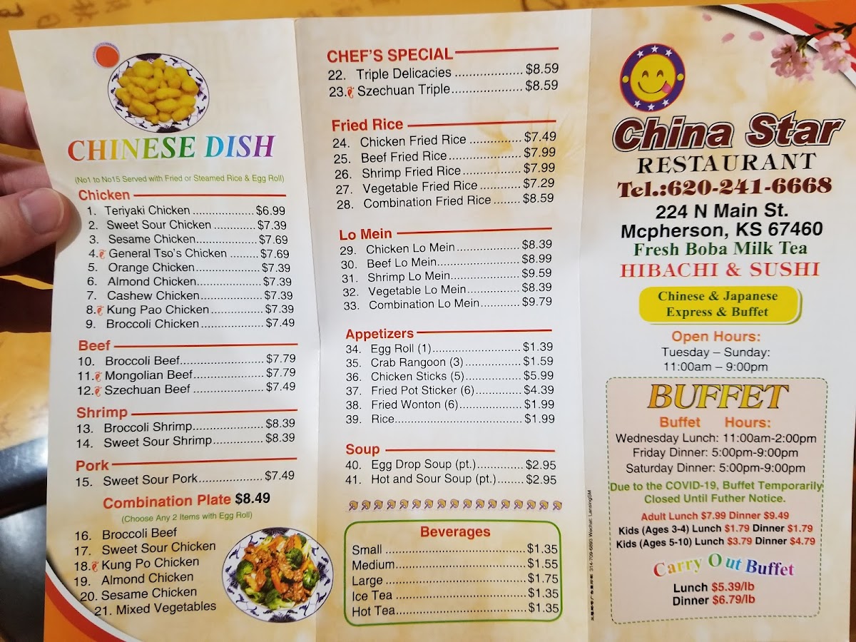 Welcome to China Star Restaurant McPherson, where the vibrant flavors of Chinese cuisine meet warm hospitality. Nestled at 224 N Main St, this gem has quickly become a favorite among locals and visitors alike. The menu boasts a delightful array of options that cater to every palate. From the classic Kung Pao Chicken, praised for its perfect heat and mouthwatering preparation, to an impressive selection of sushi, you'll find dishes that consistently impress.